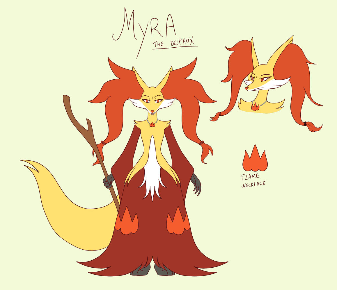 POWERS AND ABILITIES• Telepathy: She can speak to humans using her psychic powers, reaching into their minds and transmiting her thoughts through a psychic link with the receiver. Because of this, she is also able to read minds, but she doesn’t do that often as she doesn’t like to pry on other’s thoughts.• Fire Manipulation: Being a fire-type Pokémon, she can naturally manipulate fire and is resistant to it.• Psychic Powers: Being half-psychic type, she is also capable of telekinesis, visions of the future and other such powers related to the mind.• Healing: Being a witch, she has a natural knowledge of healing herbs and potions and makes them to help heal injured Pokémon and people she finds lost in her forest.• Magic Knowledge: Being a witch, she also has a knowledge of Magic, although a bit limited since magic in the Pokémon world nearly went extinct thanks to witch hunts centuries ago (according to my own headcanons)PERSONALITY Myra is sarcastic and grumpy because of her past traumas and tries to hide it through sarcasm and snarky comments. Despite this, however, she is generous and kind enough to help those in need. She doesn’t like strangers in her territory and will confront them aggresivelly if she needs to. She protects her territory and Pokémon who lives there and will often help humans who get lost in her forest. Don’t ask about her past though, as she doesn’t like talking about it and will get aggressive and moodier. She is quite cynical and distrustful of others but underneath her cynical nature, deep down she is a very lonely vixen who is still mourning the loss of her trainer and blames herself for not being able to protect him. Once you get through her shell, she will become a good and tender friend. She is extemely loyal and protective towards the ones she cares about, even becoming aggressive if she needs to in order to protect them. She also has a great motherly instinct towards little ones.She prefers avoiding battles if she can, even though she is experienced enough to fend for herself. She has seen too much violence and, according to her own words, “she is a witch, not a fighter.”Myra is quite skeptical of the gods and she doesn’t worship anyone in particular as she believes the gods are just as flawed as any other pokemon, especially because she believes they could do so much more to make the pokemon and human world a better place.As a Braixen, she’s very sassy and quite proud of herself, tending to be cocky and even a bit arrogant at times, but she’s also very playful and mischievous and likes to play pranks on others. She is also kind of a brat and a bit spoiled by her trainer.BIO/BACKSTROY As a Fennekin, Myra was abandoned. She was later found by a young man named Arwin, who worked as a voluntary in an non-profit institute that seeks to help lost and abused Pokémon to release them back into the wild or help them find good owners/trainers. She was feral at first, but soon she began to trust Arwin and became his partner Pokémon.In the institute Arwin worked in, she met and befriended a young Riolu, but their friendship would soon become sort of a rivalry to see who’s the best. They would often compete with each other and train together. Upon evolving to Braixen, she began to develop feelings for him, now evolved to Lucario, but she never admited that to herself or to him, acting like the typical tsundere girl who’s always aggressive and mean to her love interest in an attempt to hide her real feelings for him.However, not everything would be great forever. When Latios revealed his true colors and desire to extinguish humankind so that Pokémon could rule the world that - in his opinion - rightly belonged to them and went on a murder rampage, using the evil in human’s hearts to corrupt Pokémon into chaos creatures that only blindly followed his orders, he attacked the Institute so he could recruit the Pokémon there and in the process, he brutally murdered Arwin in front of Myra and proceeded to recruit her to his army of Chaos Pokémon, wiping her memories and transforming her into one of his Chaos puppets.She had a harsh training while under Latios’s control and she eventually evolved during that time to a Delphox. Latios trained her to be his personal seer.However, during one of her visions, she has a glimpse of the past, of the attack on the Institute, making her get her memories of Arwin back and snap out of Latios’s mental control.Filled with remorse, shame and guilt for what she’d done while under Latios’s control, she isolates herself in a forest, becoming a lonely witch. She becomes known as The Forest Witch by the local Pokémon and often helps hurt Pokémon and humans who get lost in her forest, though she can still have a hard temper because of her past traumas. She still mourns the loss of her trainer and keeps a portrait of him in her tree home, making him a small shrine in his memory.